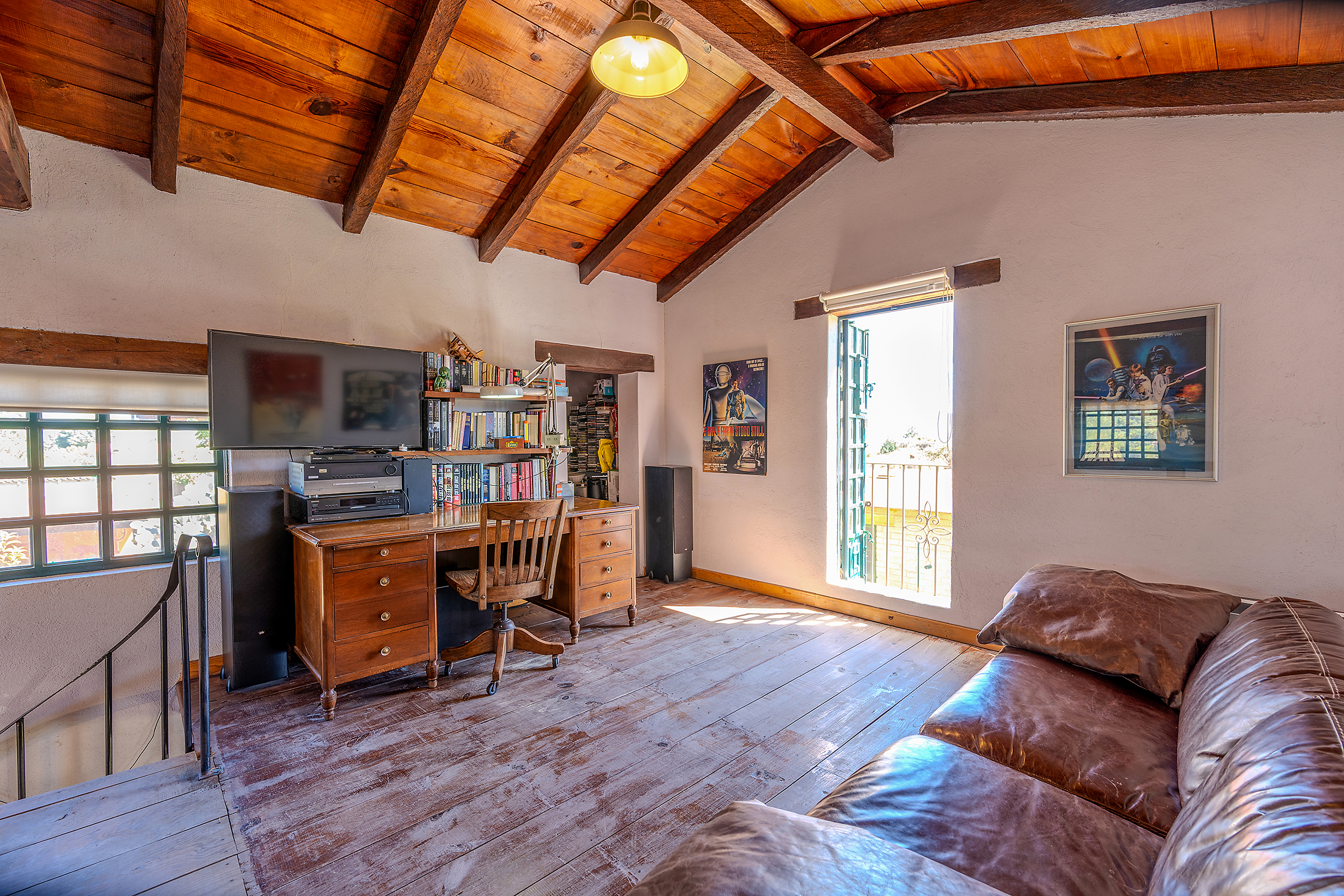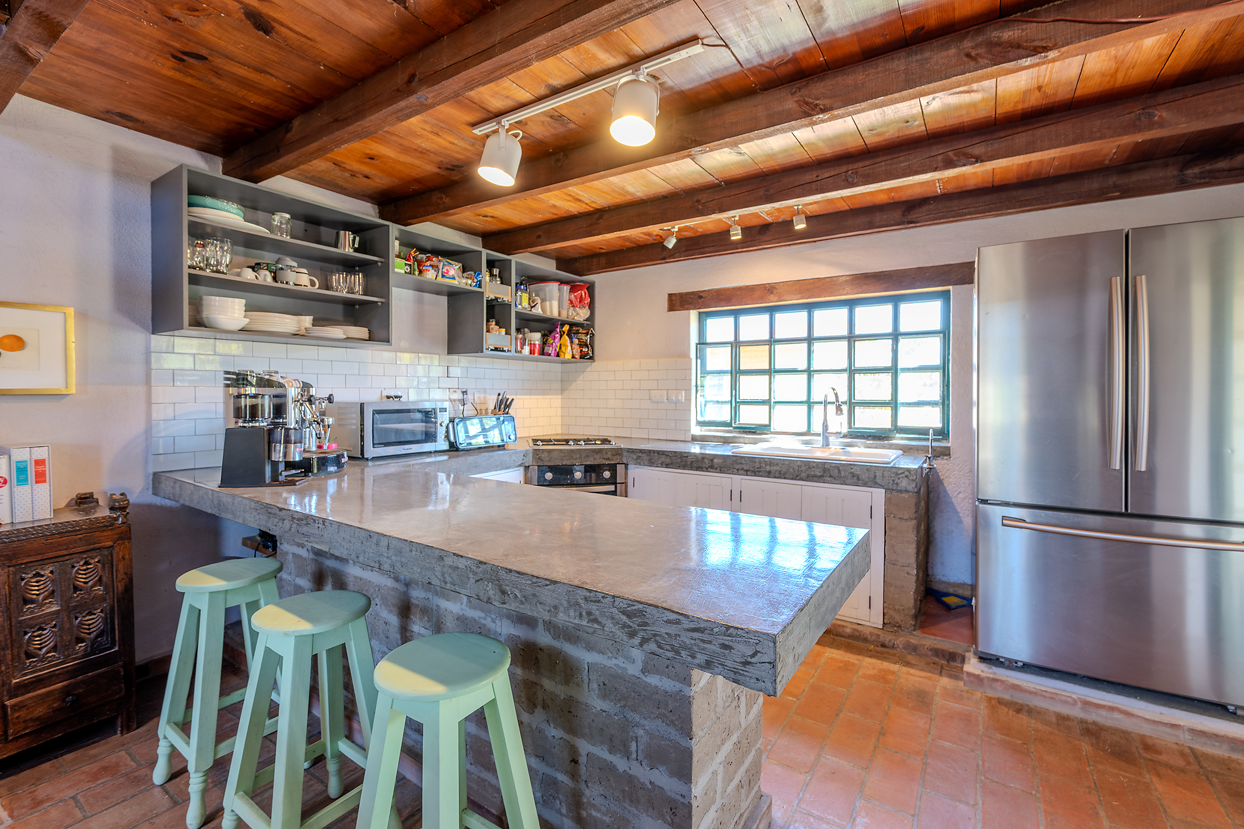 • 🧱 Adobe walls, red brick floors, beamed ceilings & Spanish Hergóm fireplace